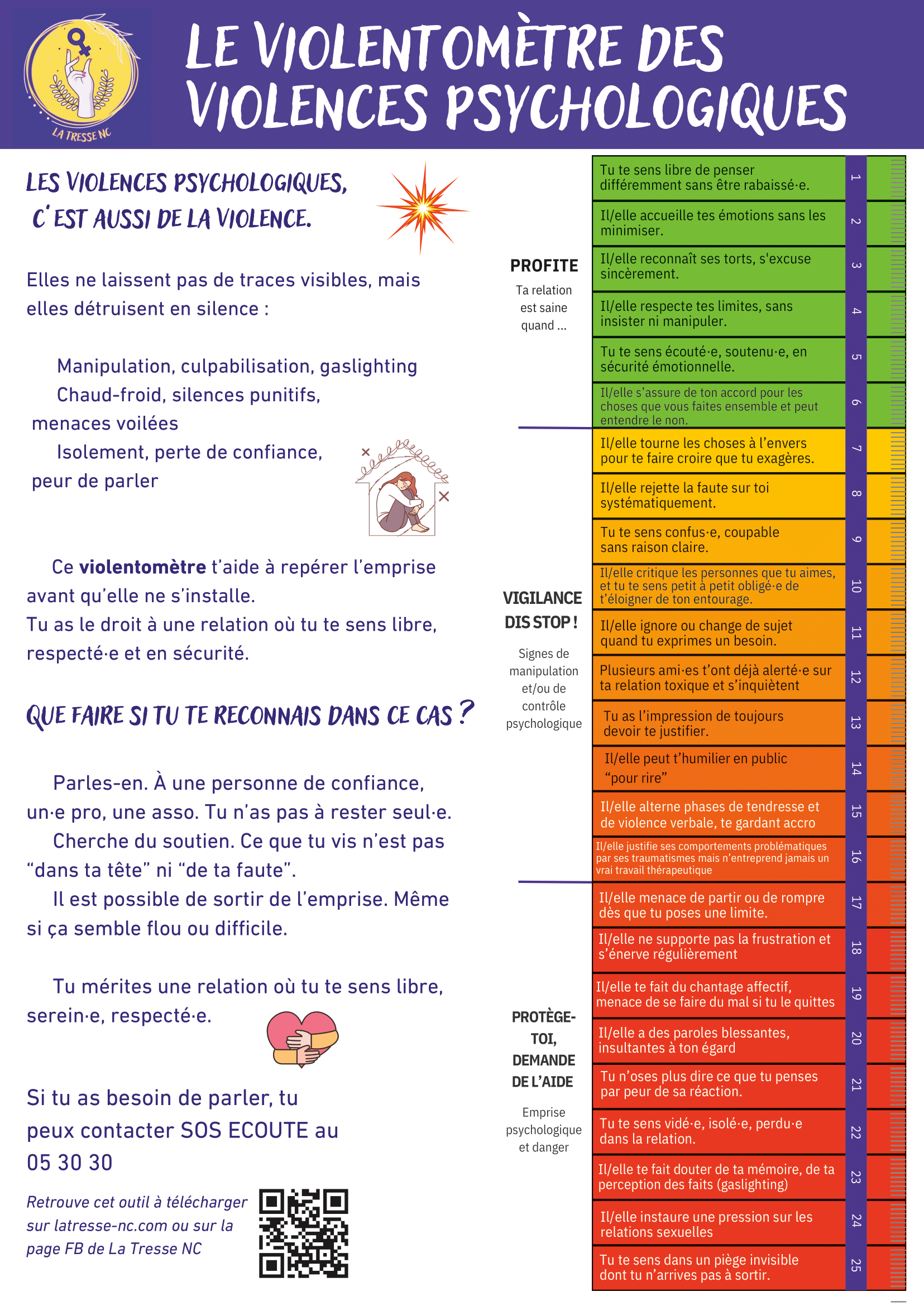 Par ailleurs, la Tresse NC a créé un violentomètre des violences psychologiques, que vous pouvez retrouver en bas de cette page.